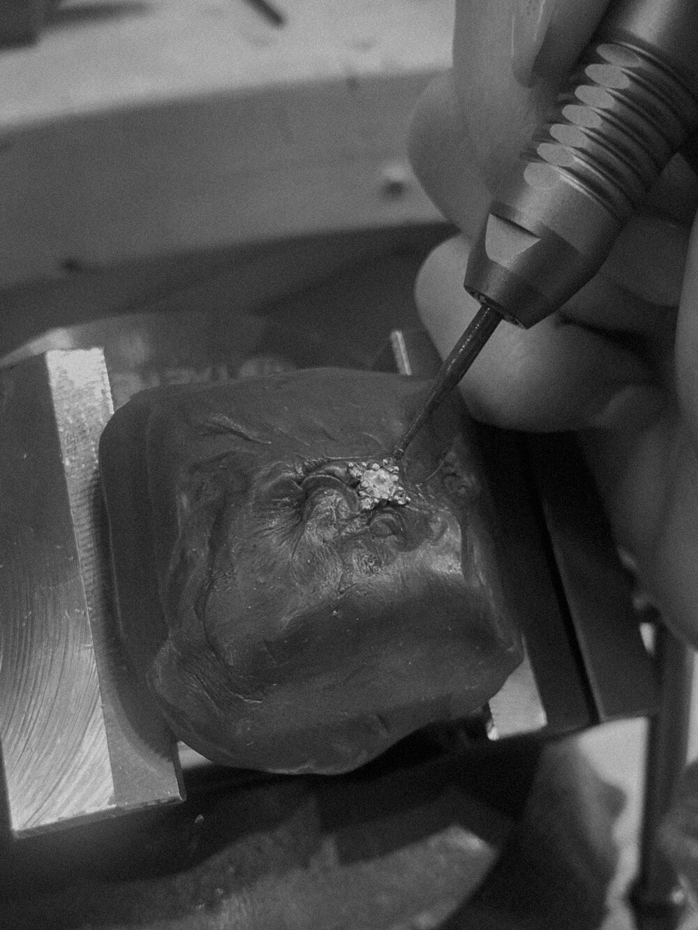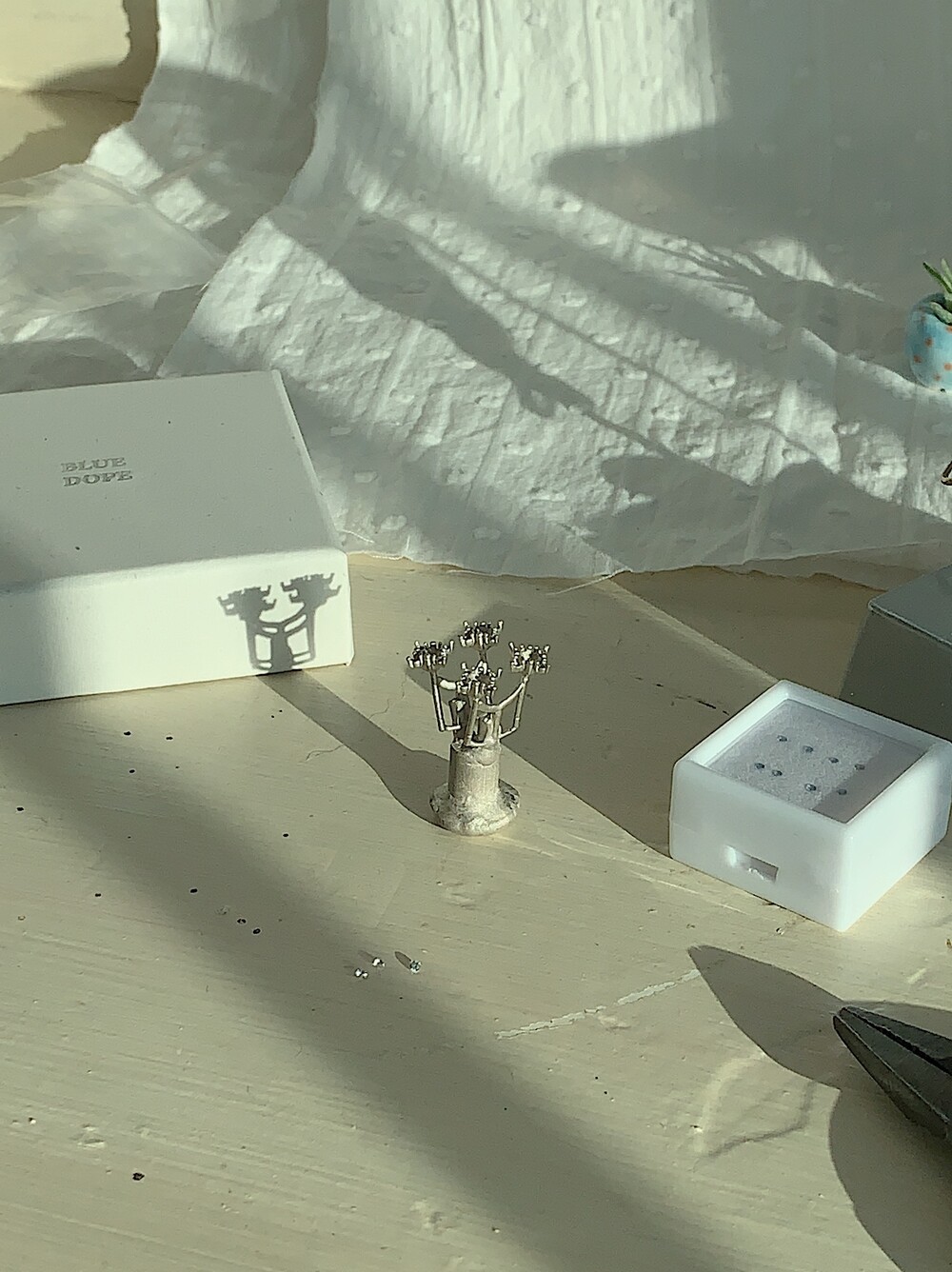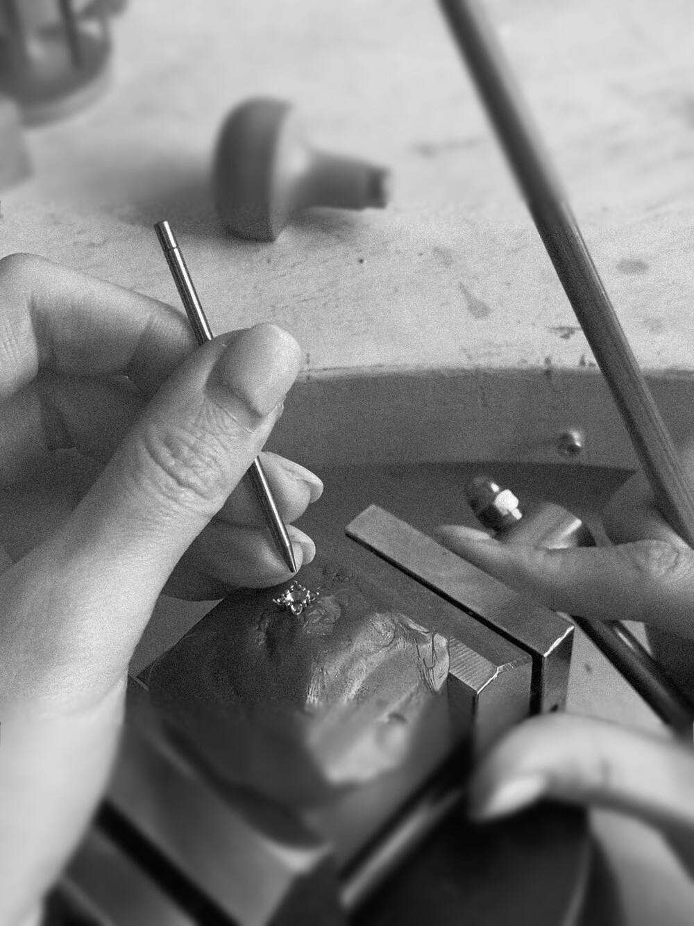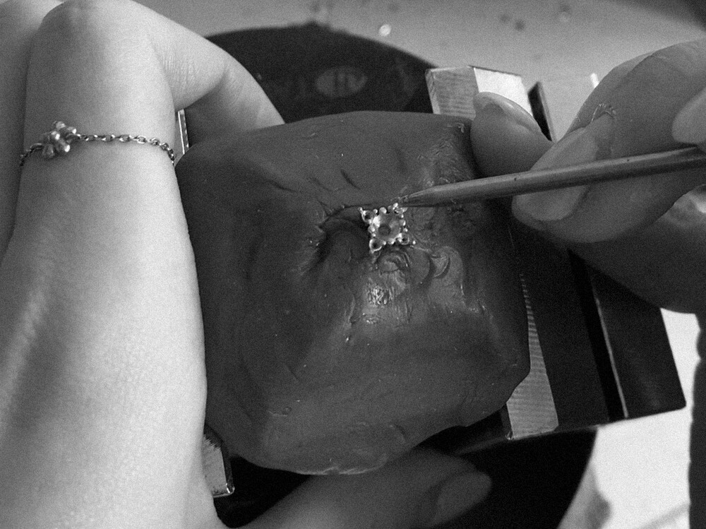 작은 사파이어를 고정하는 난발 하나하나를 동그랗게 굴려 정밀 마감 처리해,